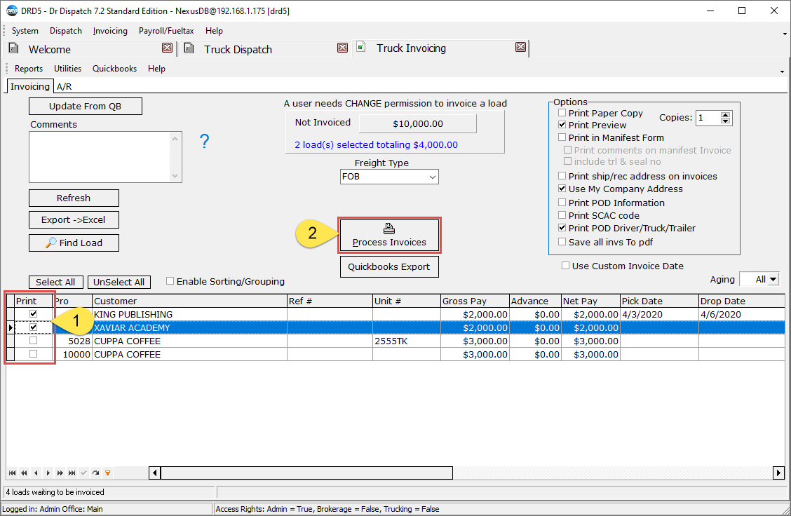 - To print and process, place a checkmark in the 'Print' field next to each invoice/load that is ready for invoicing.