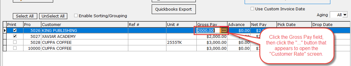 - You can edit customer rates/gross pay directly from the Gross Pay column.
