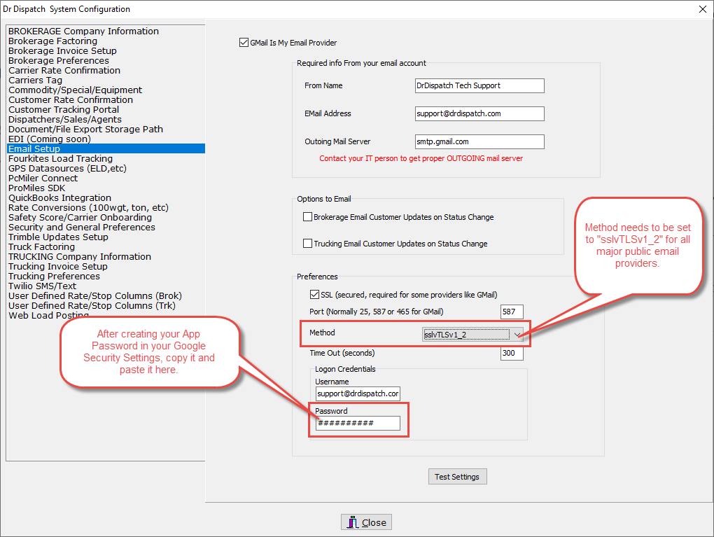 After completing the setup process in your Google Account to fully enable Two-Step Verification, go to DRD's Settings > Email Setup and fill it in similar to the screenshot below.